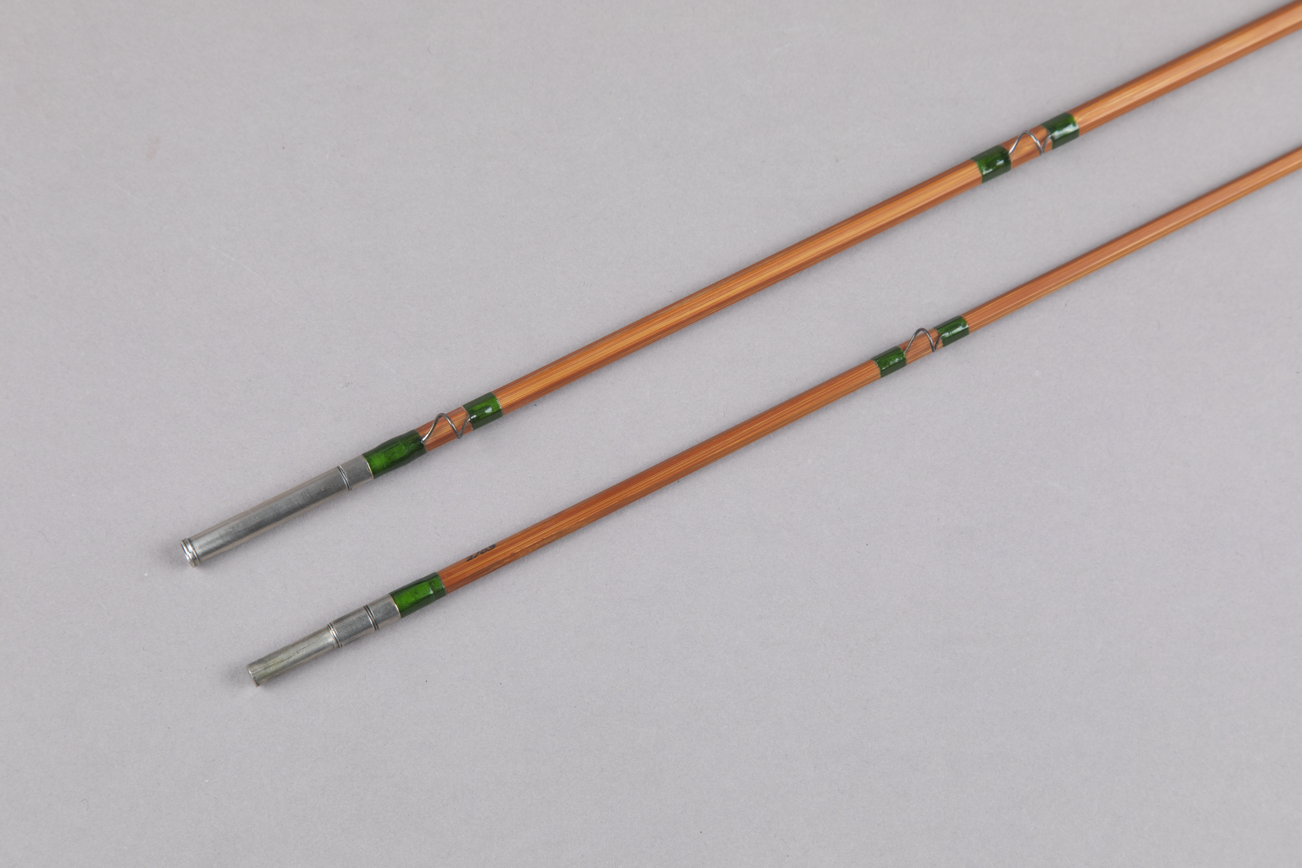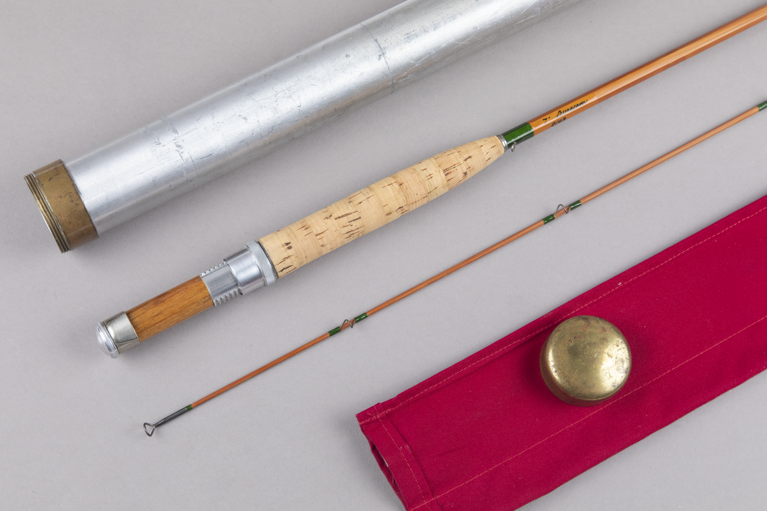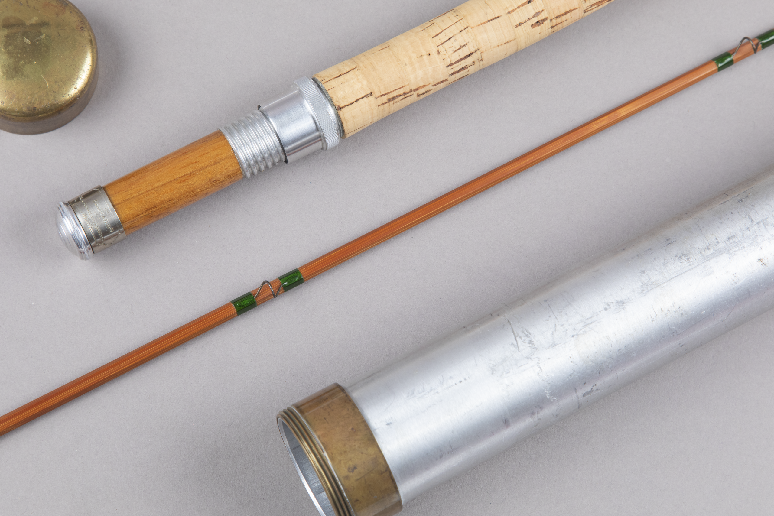 This consists of impregnated cane with green silks. Classic cigar grip measuring 5 1/2" in length shows very little use. Bright aluminum down-locking aluminum reel seat with butternut insert. The nickel silver pocket band is stamped The / Leonard / Rod / H.L. Leonard Rod Co. / Makers which is indicative of stamps from the 1920s. It is also completed with a rounded butt cap insert which is also seen on earlier rods. The green silks are more "Kelly green" than other Duracanes I have seen which are "forrest green." I do not know if this is custom ordered, refinished (there is no shadowing near the wraps), or someone purchased Duracane blanks and built it this way. The action is on the fast side. Replacement bag.