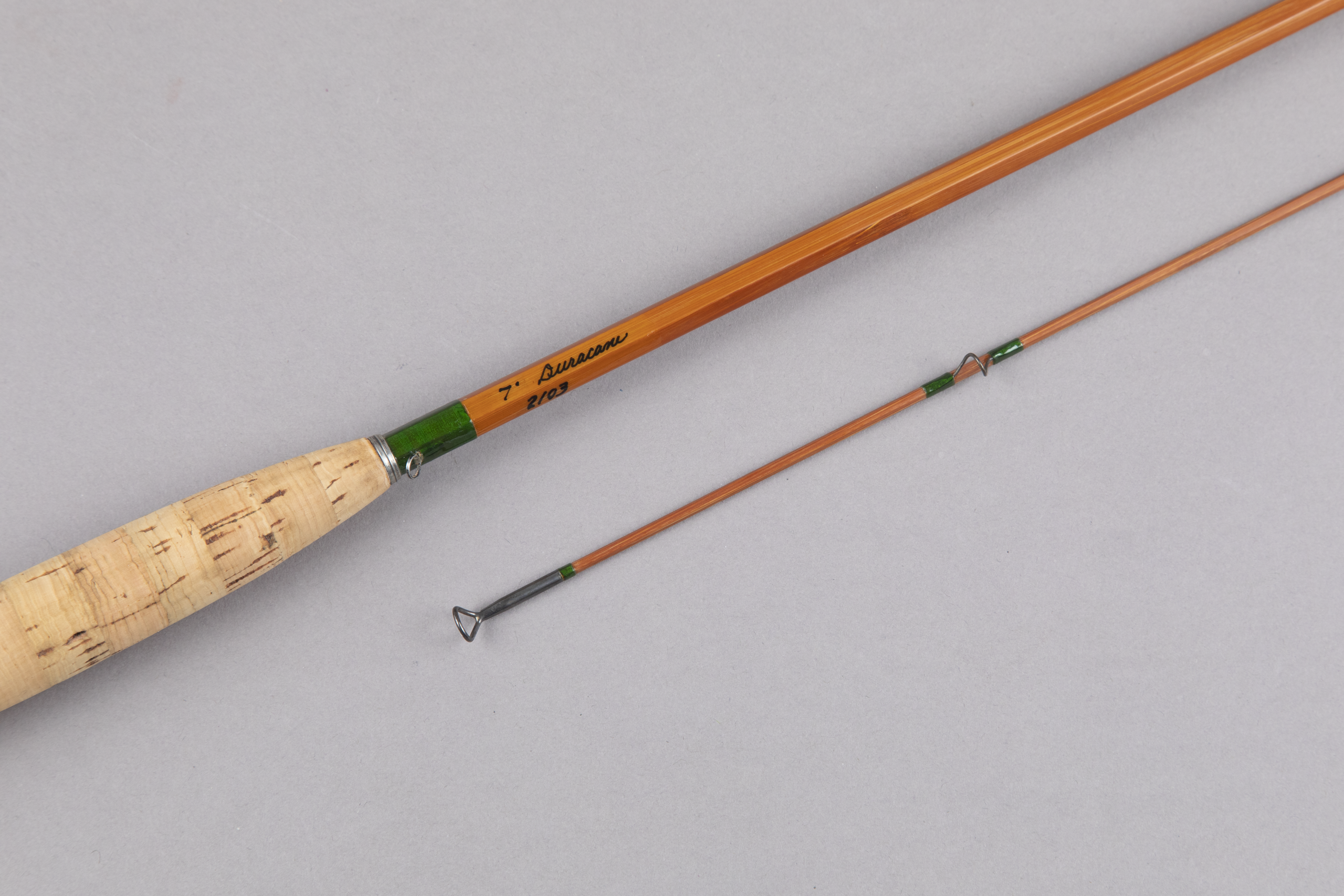 For your consideration is a Leonard Duracane "Green Wrap" bamboo fly rod. This is a 7' 0" two-piece for a 5 or 6- weight line weighing 3.75 oz. The owner liked a 5-weight line on this but I can see how some will like a 6-weight.