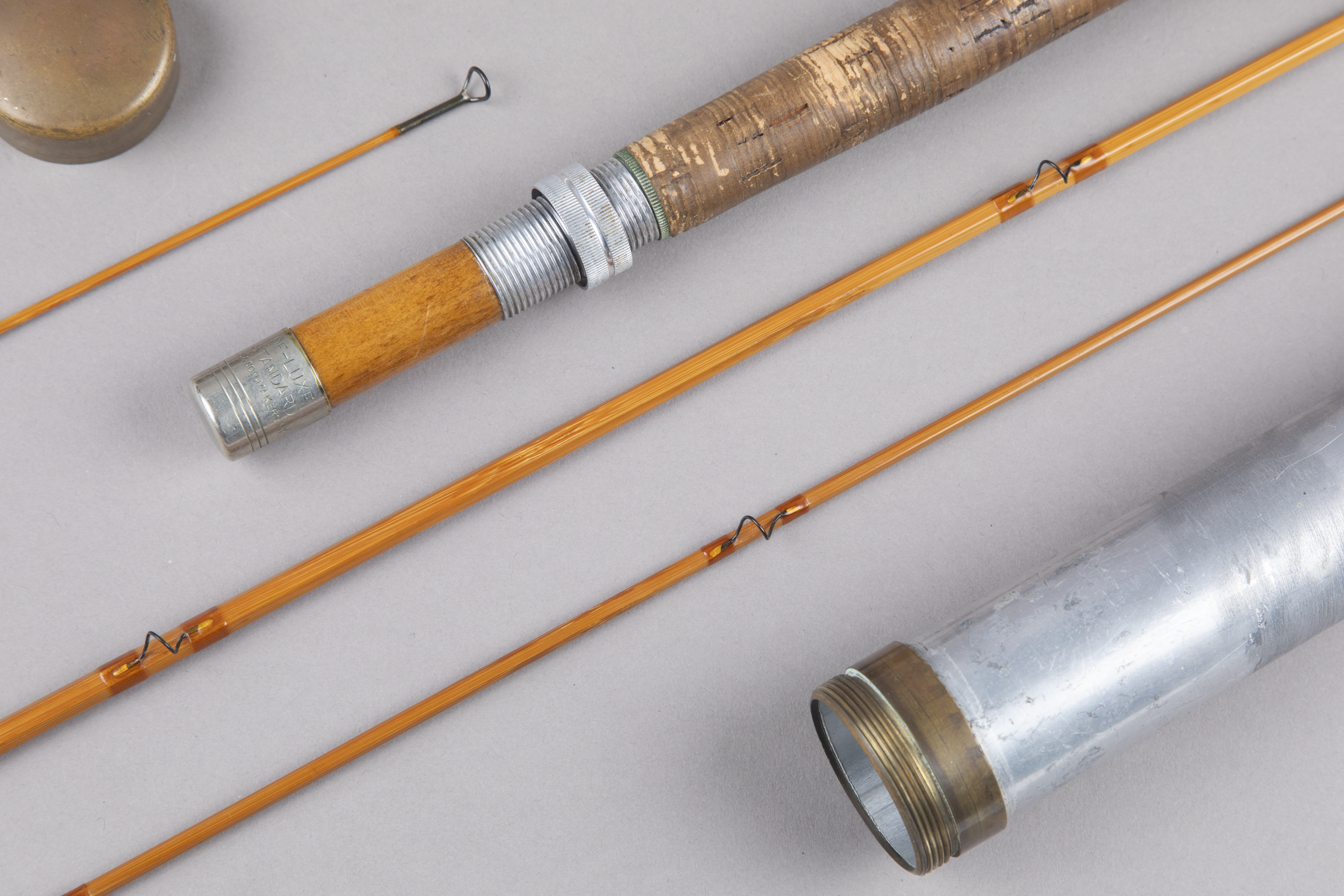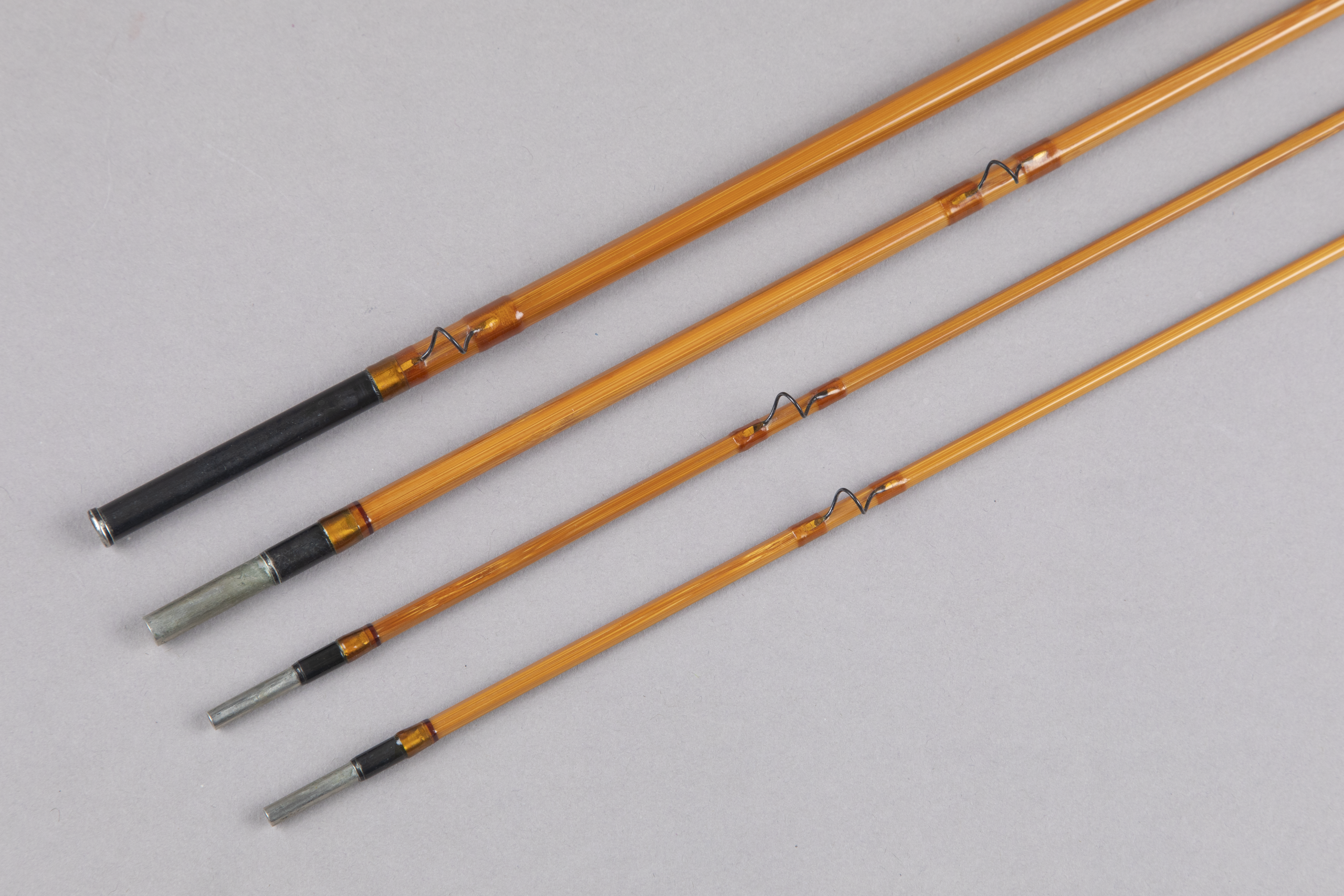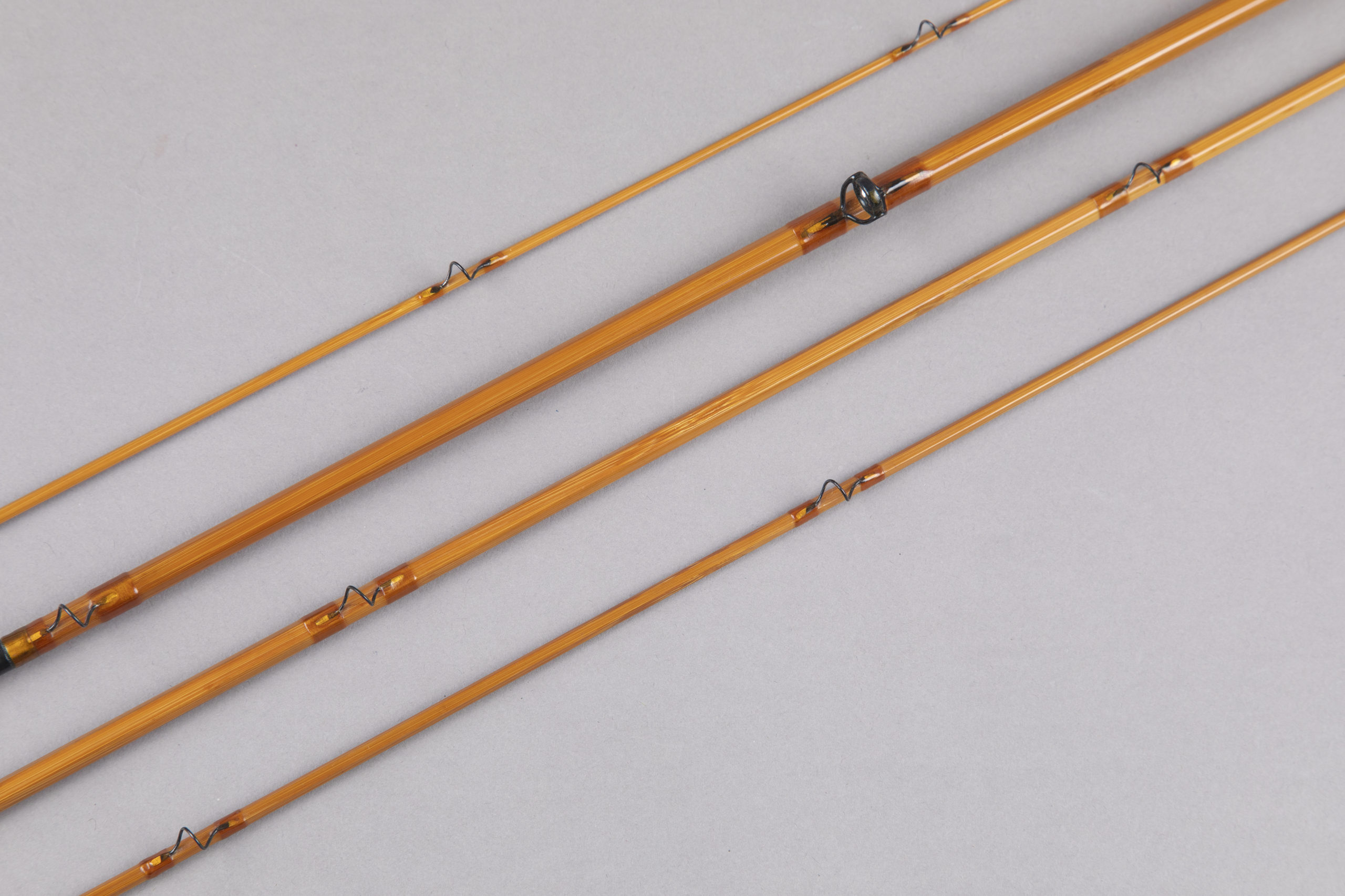 This rod consists of lightly tempered cane with golden brown wraps that match the color of the darker areas of the blank. The 5" grip is soiled but only has very minor ridging. The butt cap is stamped "De-Luxe / Standard / Mills & Son Makers, N.Y." The ferrule fit is as it should be. In my hand, the action is medium fast with a delightful dry fly feel – this feels like a 50DF. There is some wear to the cork where the thumb rests. When the current owner purchased this it was represented as having been refinished by Tom Maxwell.