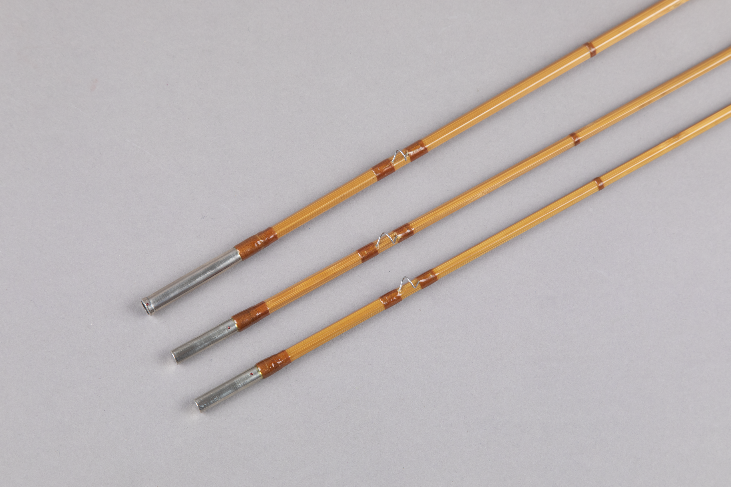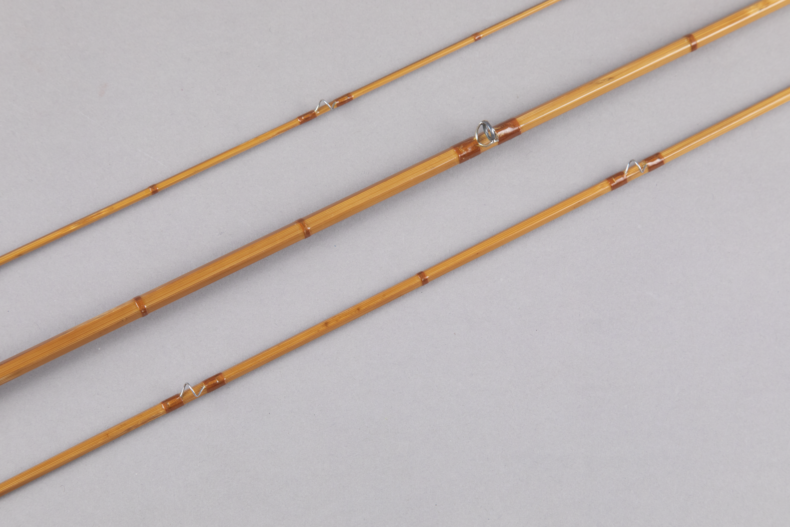 This rod consists of lightly tempered cane with chestnut wraps. The modified Wells grip grip measures 6" in length. Up-locking aluminum hardware. In my hand, the action is medium-fast.