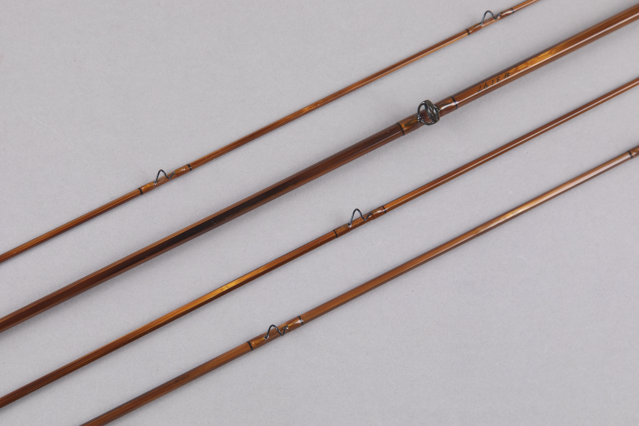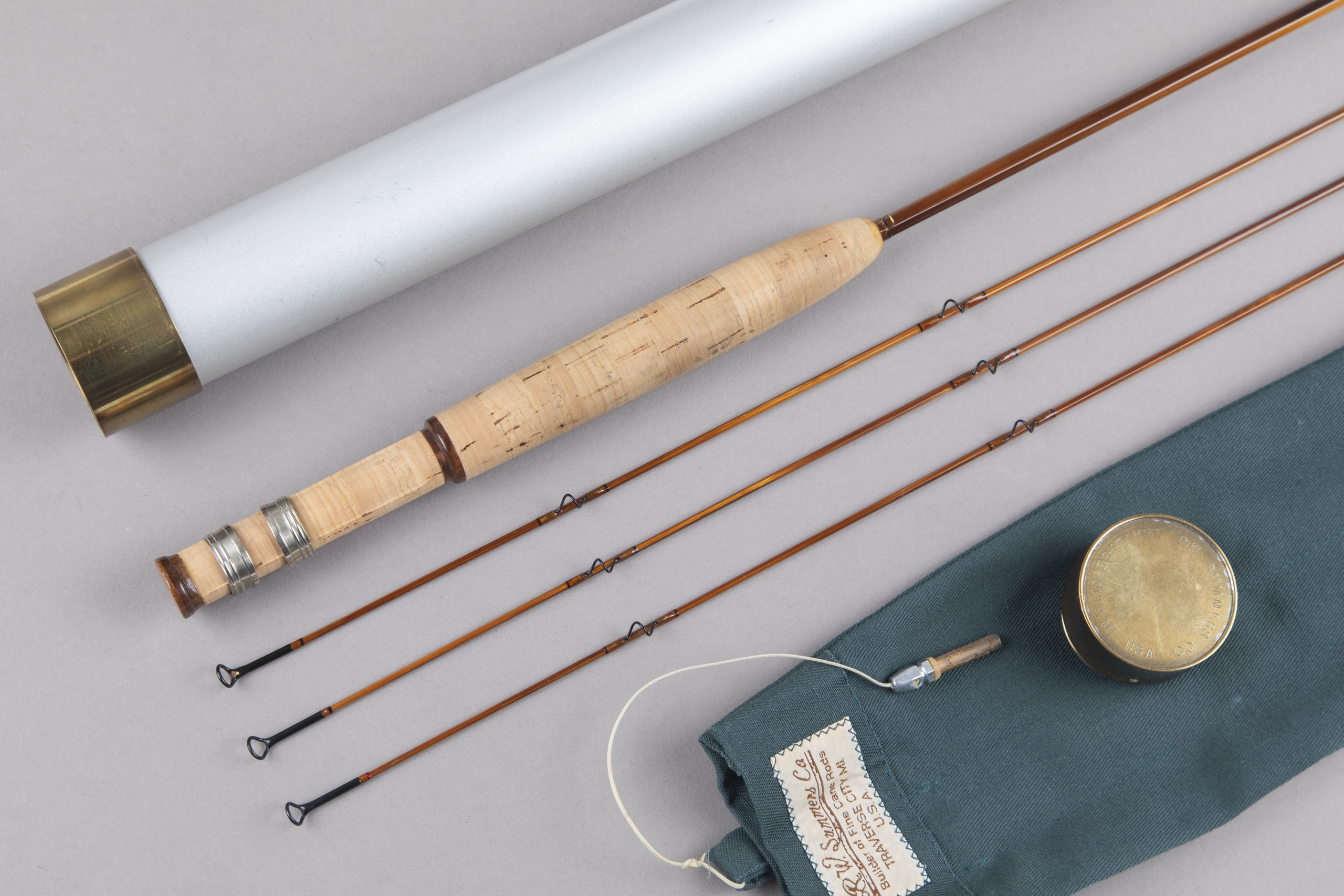 This consists of dark flamed cane wrapped with translucent caramel silks matching the color of the cane and then tipped black. The 5 1/2" grip, which appears unused, meets a wood reel seat check and is finished with a wood laminated butt section with exposed bamboo flush at the end. The nickel silver sliding rings makes this a deluxe model. Almost immediately after deliver of this rod in 1997, the owner broke a tip between the second and third guide above the male ferrule. Bob repaired the tip and made a new one. Original bag and tube with ferrule plug tethered to the bag. A like new rod from a builder that is a living legend.