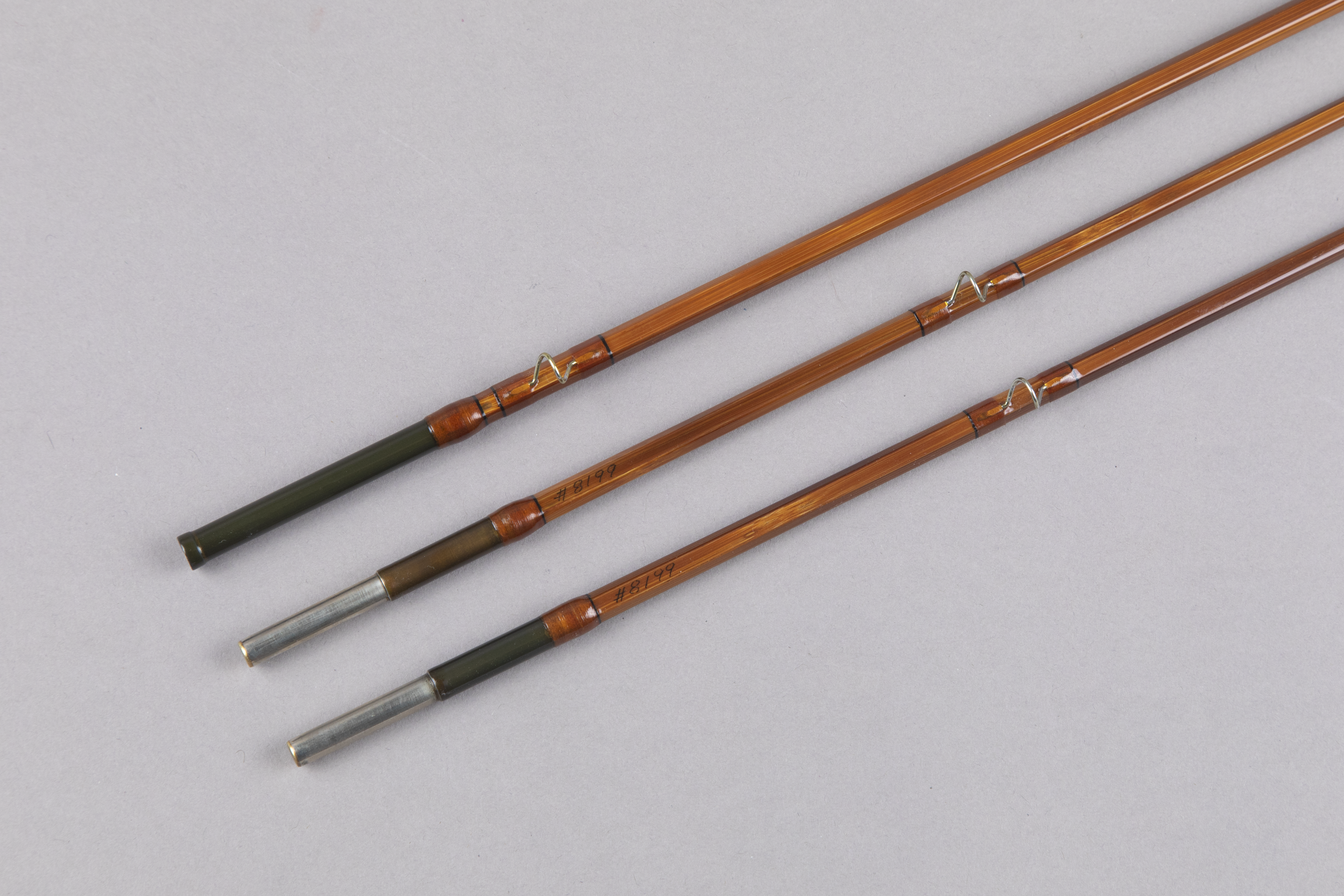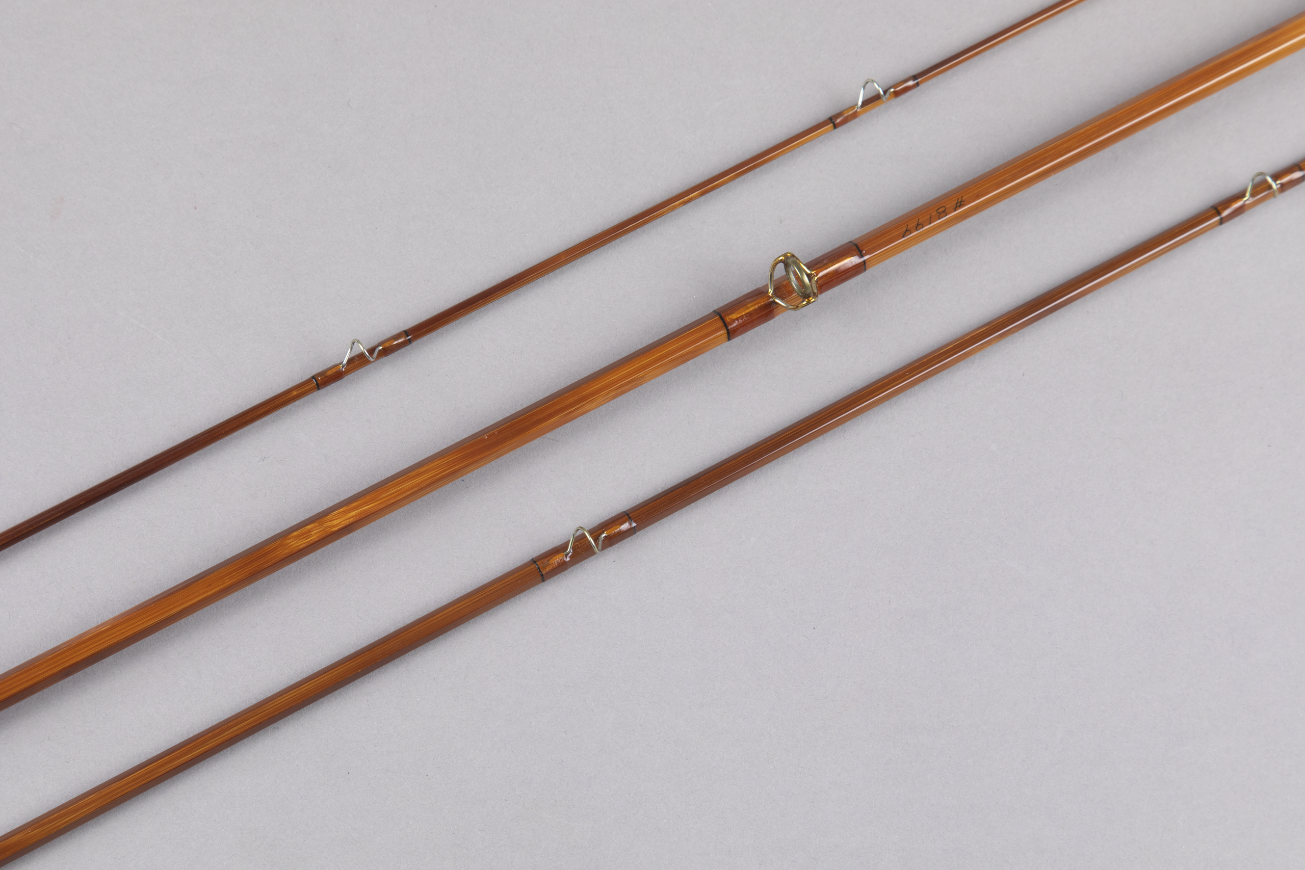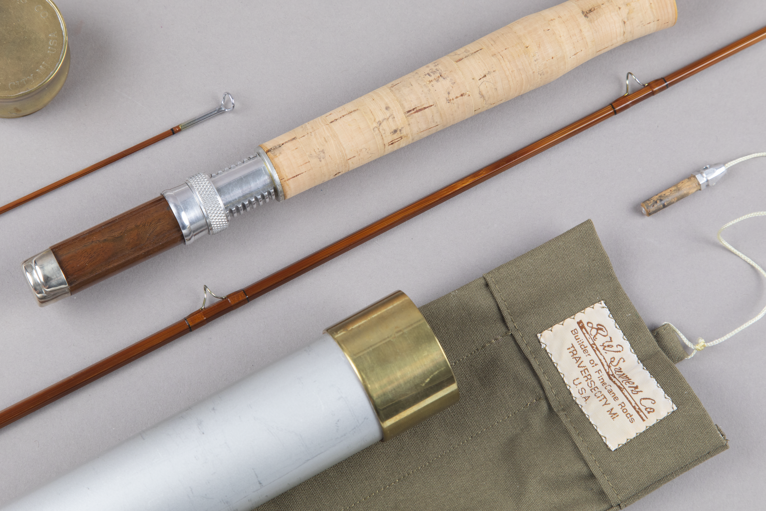 This consists of dark flamed cane wrapped with translucent caramel silks tipped black. The reverse half wells 6 3/8" grip is in like new condition. Down-locking aluminum hardware with a nickel silver butt cap stamped "R.W. Summers Co. / Traverse City, MI USA." In my hand, the action is medium-fast. Original bag and tube with ferrule plug tethered to the bag. A like new rod from a builder that is a living legend.