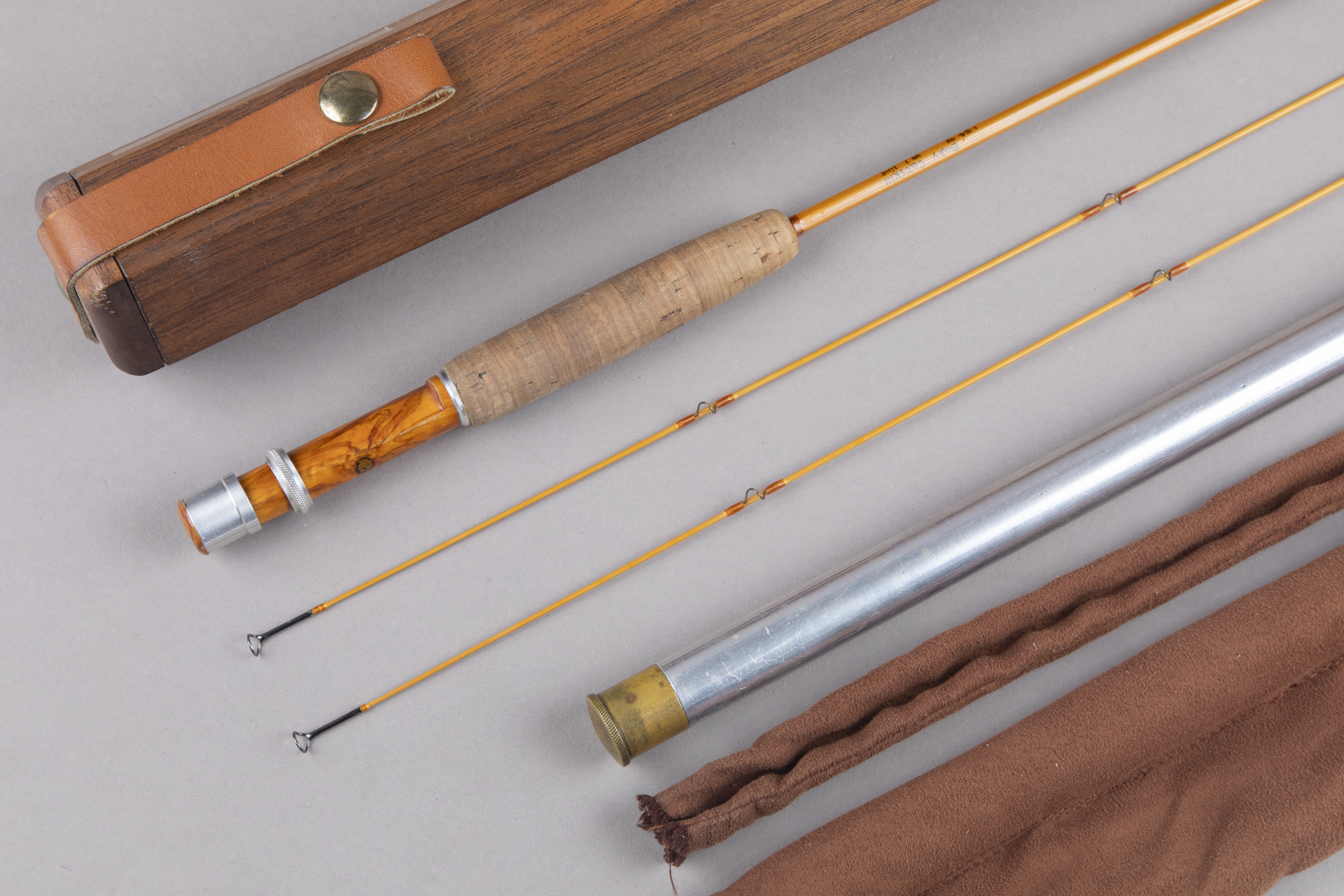 This consists of light tempered cane with amber orange wraps tipped with an ivory cream – a very handsome combination. The grip measures 4 inches with cap and ring over a well modeled insert matching the cane coloring. In my hand, the action is medium-slow and delicate. Comes in a walnut hex case with a leather strap closure with an aluminum and brass tip tube.