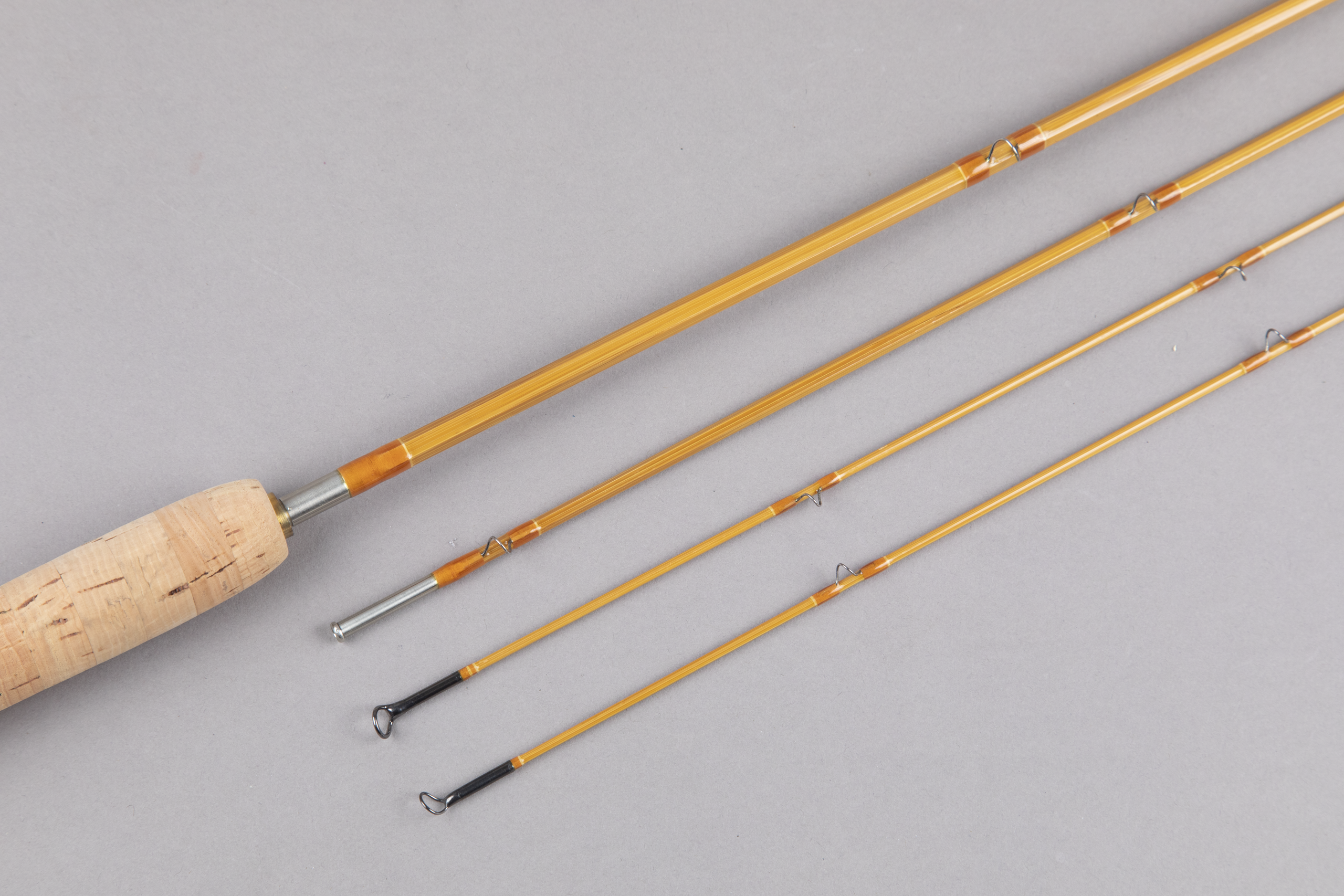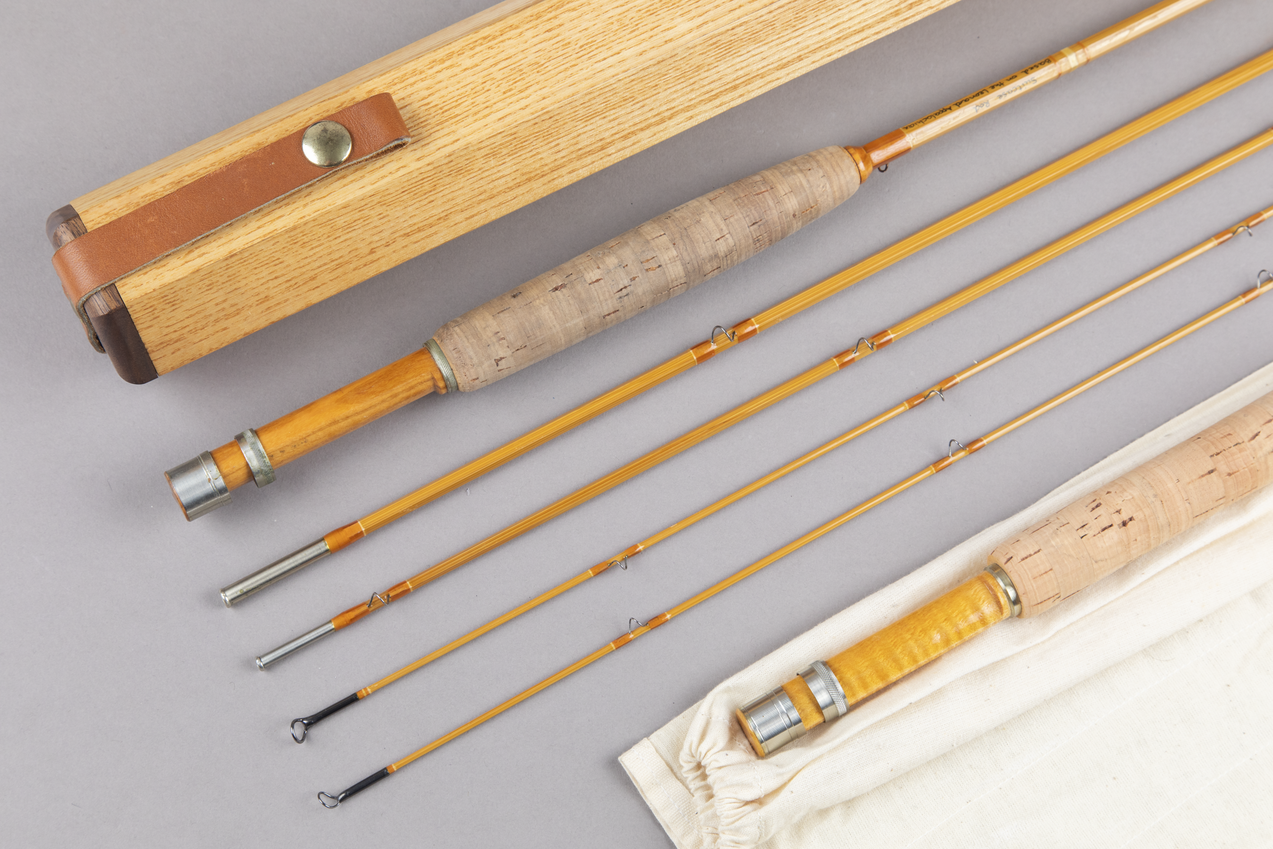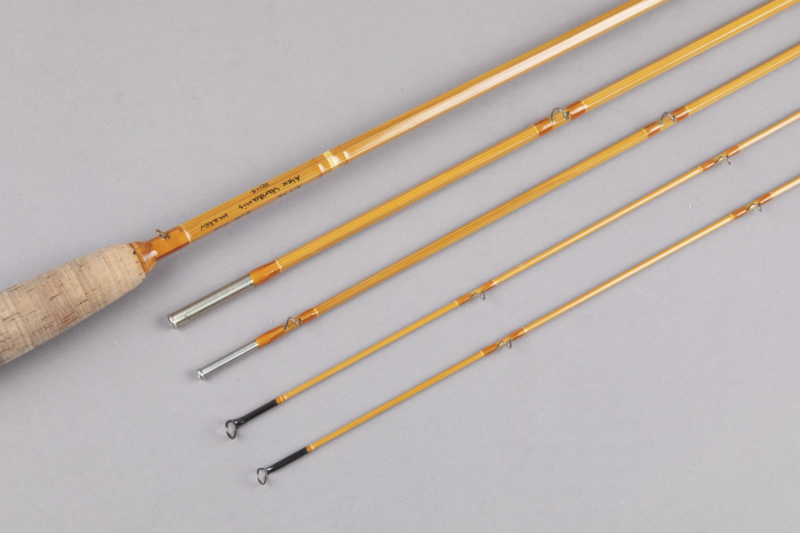 For your consideration is an Alex Vardanis Appalachian / Pack Saddle / or Suitcase bamboo rod. Whatever you call it, Alex's spin on the Leonard model is quite smart; the second grip is used to replace the butt section of the 8' 0." This is an 8' 0" four-piece for a 5-weight line weighing 4.15 ounces and a 6' 9" three-piece (or include the grip as a 4th piece) for a 4-weight line weighing 3.75 ounces.