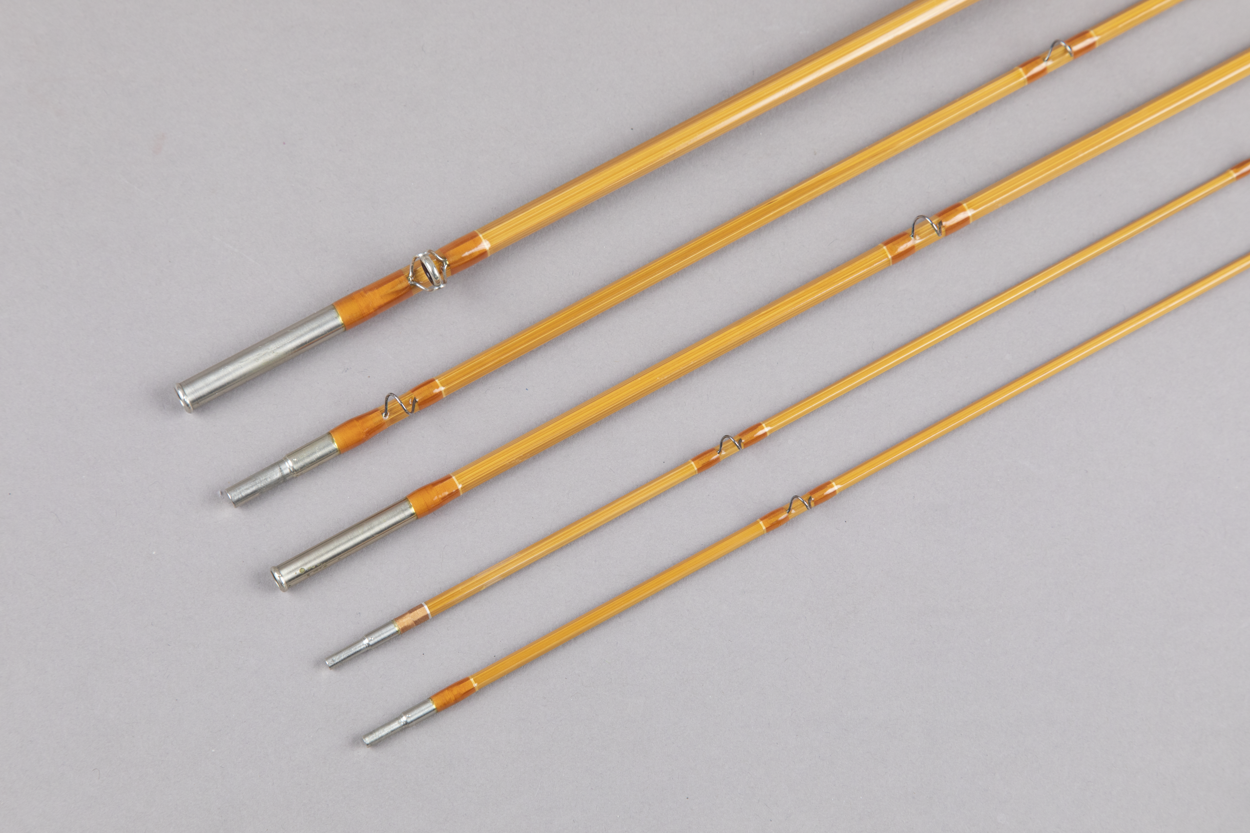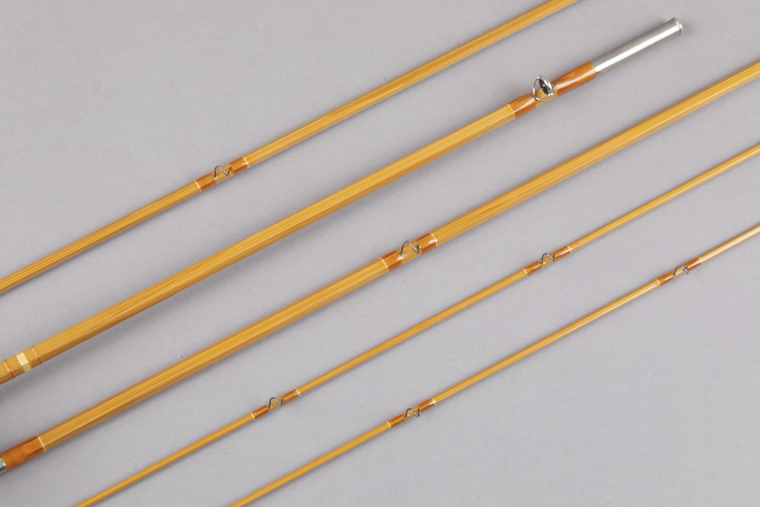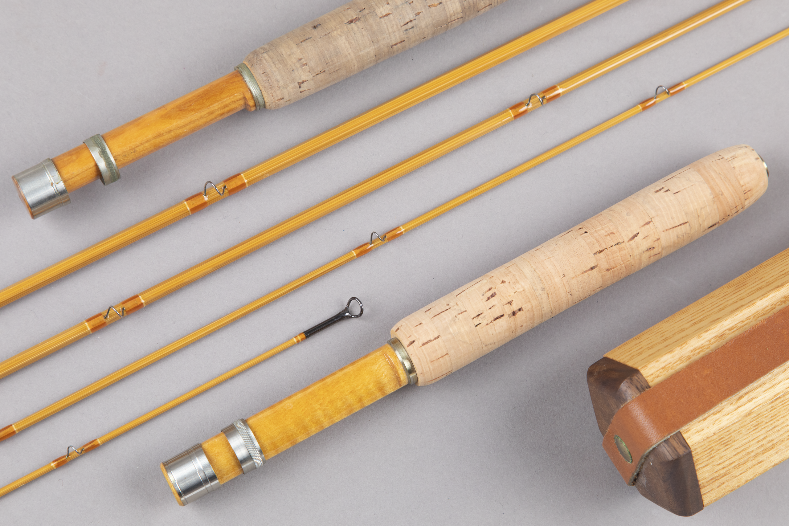 This consists of light tempered cane with amber orange wraps tipped with an ivory cream – a very handsome combination. Both grips measure 5 7/8 inches. In my hand, the action is medium-fast. Comes in a hex wood case with a leather strap closure.