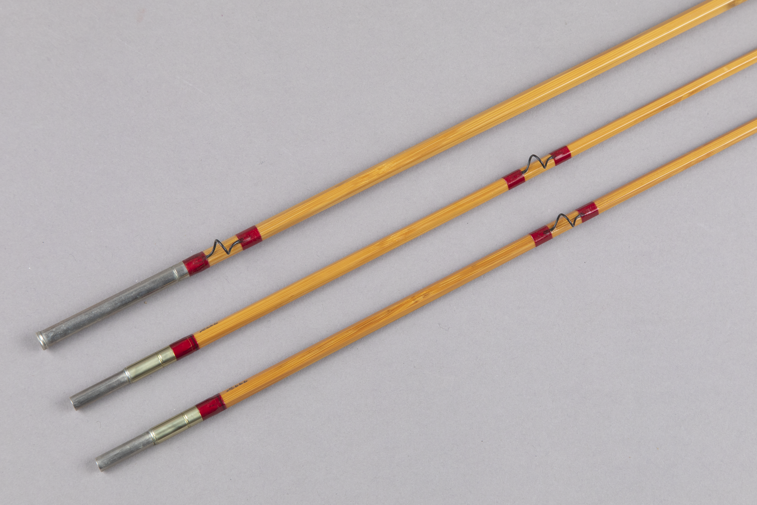 This consists of Leonard indicative straw colored cane with crimson red wraps. Classic cigar grip measuring 6" in length with bright aluminum down-locking reel seat with butternut insert under properly die stamped nickel silver cap. In my hand, the action is on the fast side of medium-fast. There are some water marks in various areas of the blank.