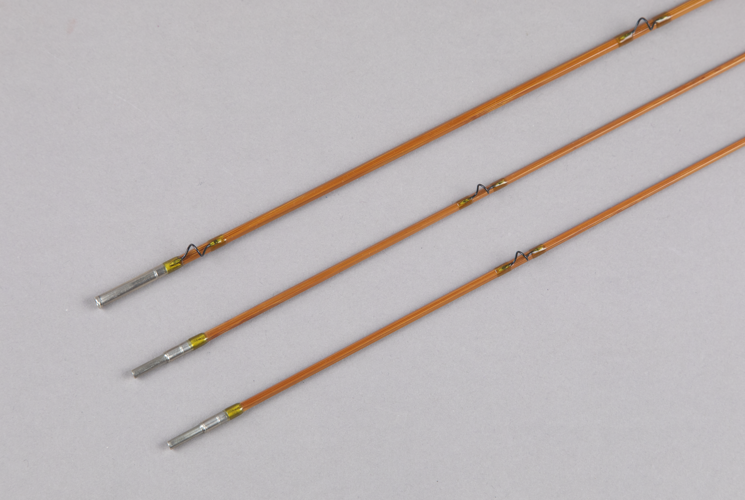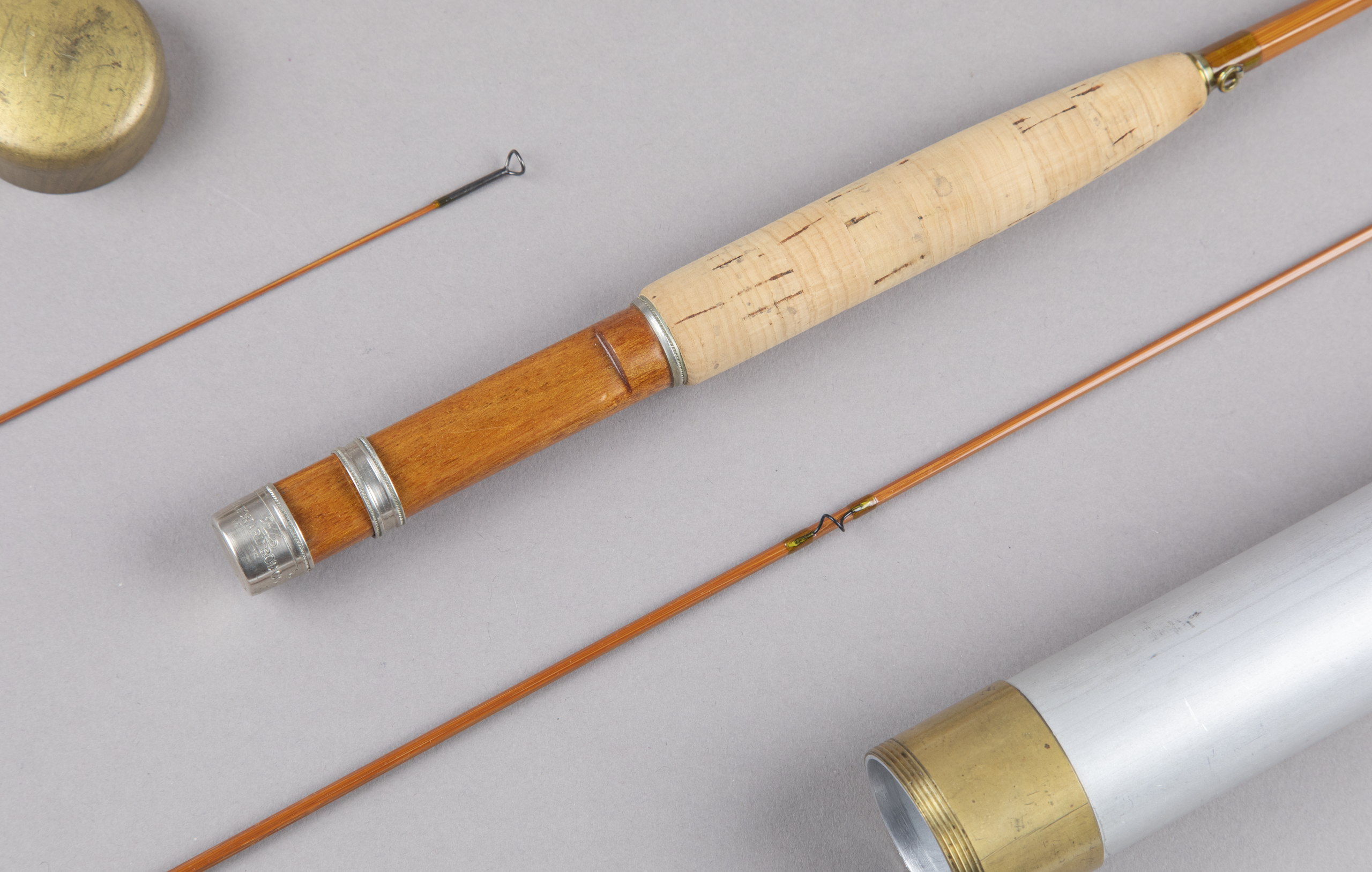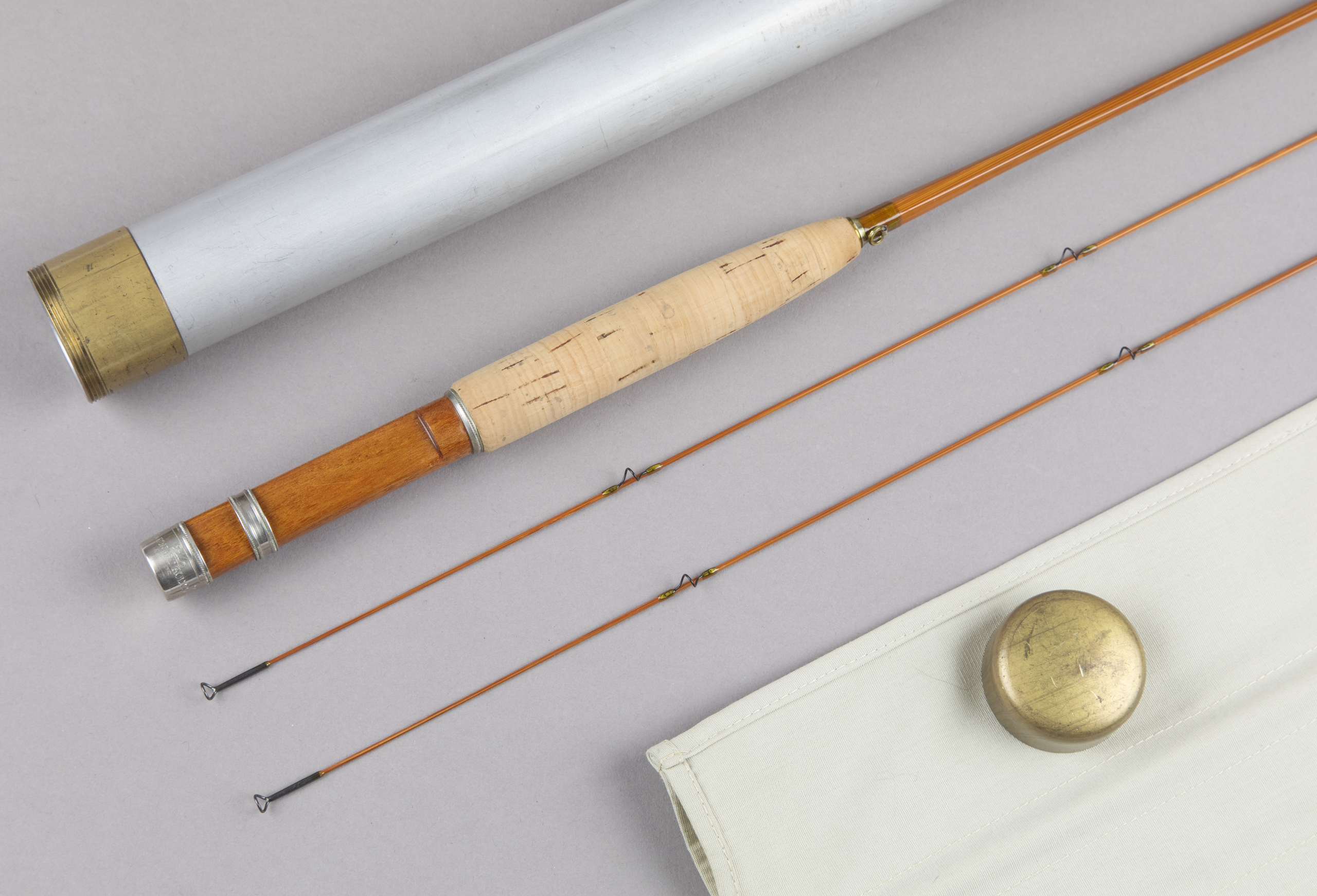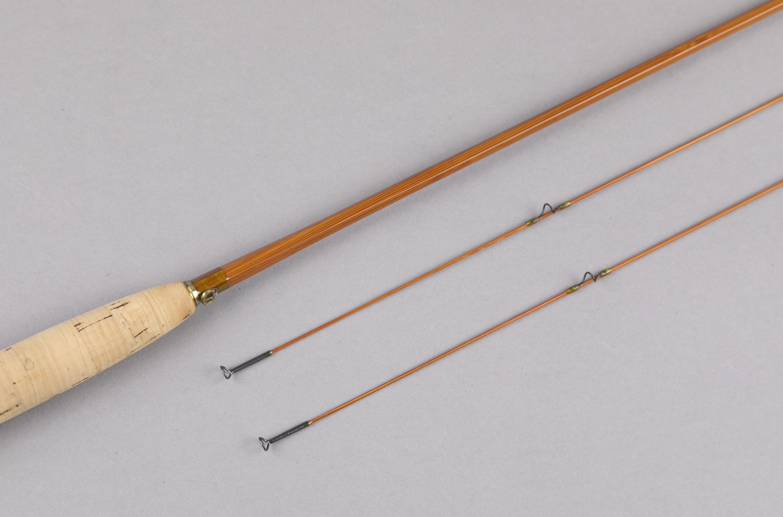 This consists of Leonard indicative straw colored cane with olive green wraps and a handsome swelled butt. The grip measures a diminutive 4 1/2 inches with a cap and ring over mortised butternut wood spacer. The ring fits snugly. The tips mic at 0.0430 and 0445. The Swiss-style ferrule is size 8. In my hand, the action is medium and is the lightest and most wispy wand I have personally held. This is a post-fire rod with the HLL logo roll stamped on the butt cap. It is sans serial number making this a pre-1969 made rod. This rod comes from an extraordinary collection of Leonard rods and has never been fished.