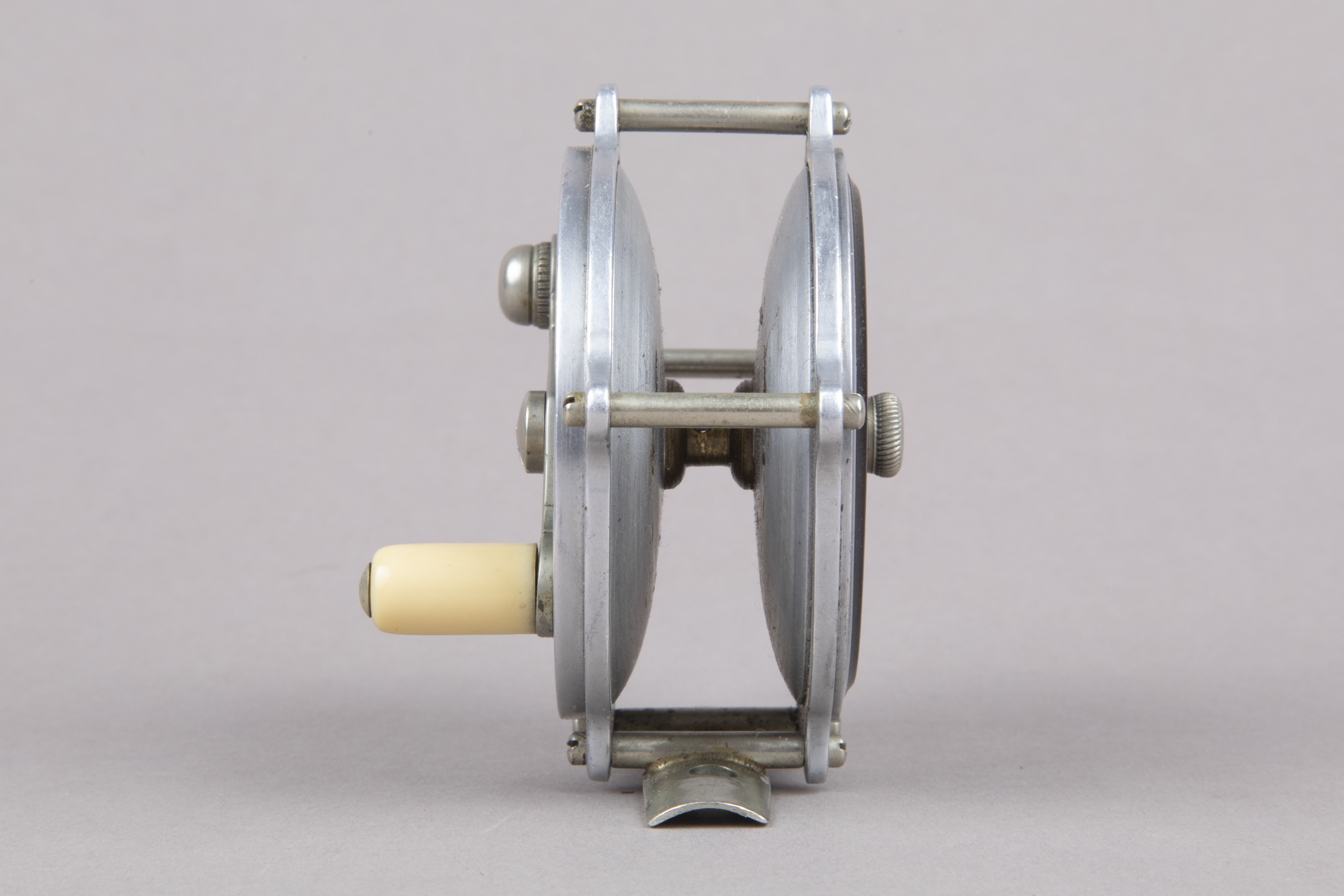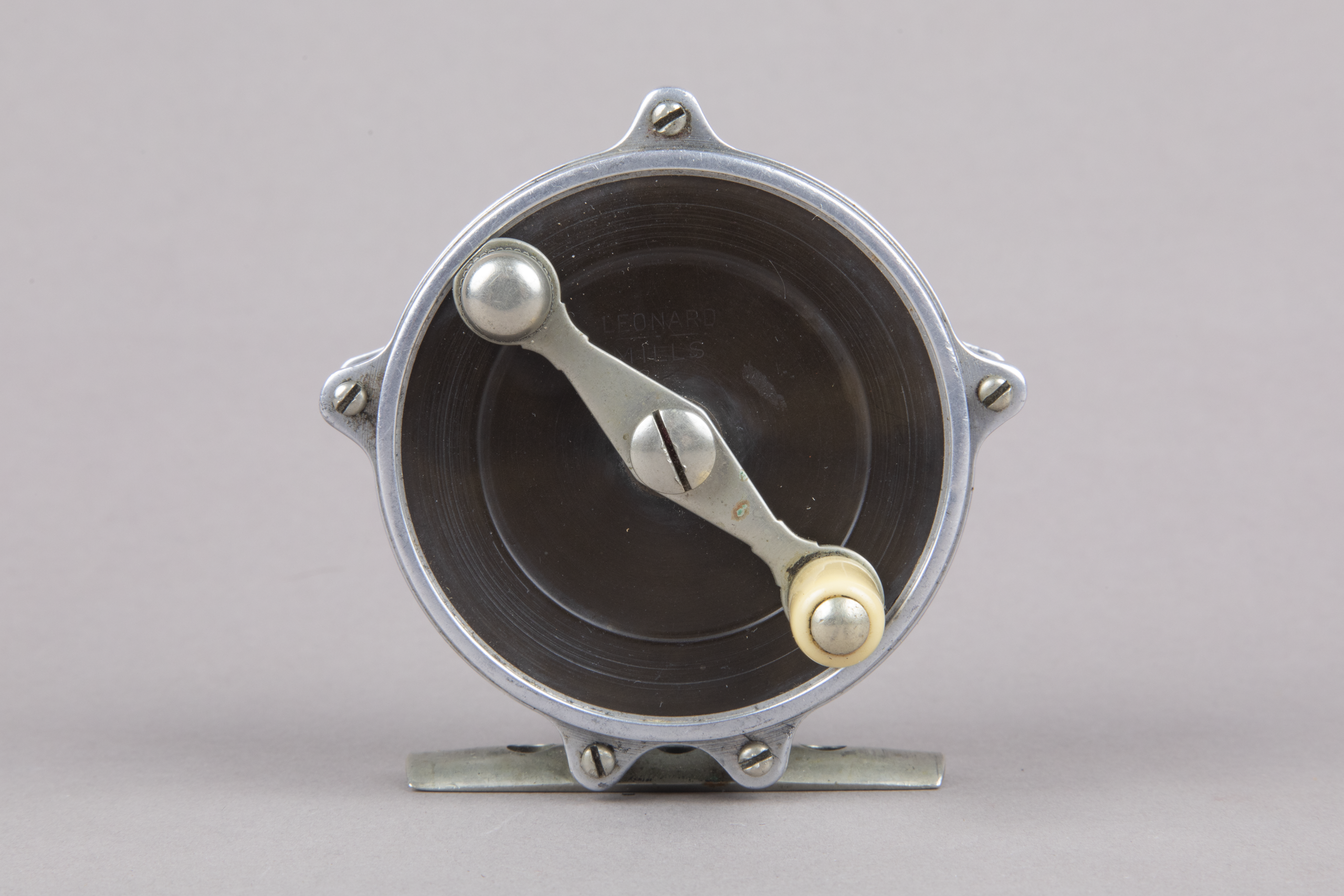 This consists of hard rubber side plates with an aluminum raised pillar frame. The cross pillars, screws, rear cap, handle, and foot are nickel silver. The reel is in excellent mechanical condition. The nickel silver foot is unmolested. There is one small scuff on the front rubber plate with the back only showing minor signs of use. This is surprisingly clean for its age. It is a fixed check reel set for a neutral wind. Although it was not captured well in the photos, the Leonard Mills stamp on the front plate is clear and complete.
